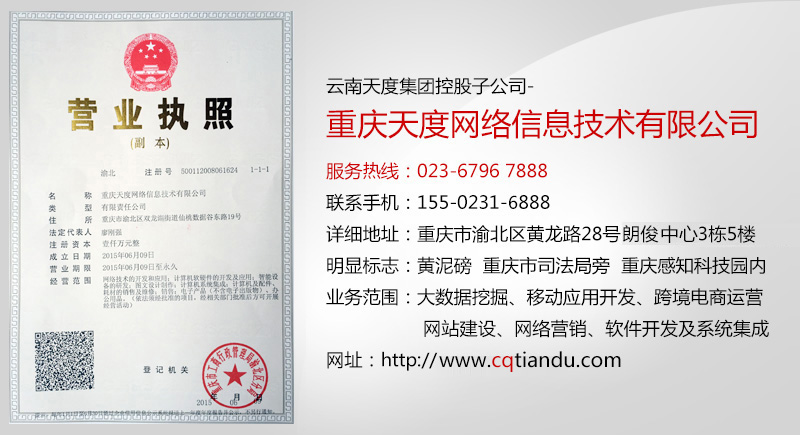 云南天度集團控股子公司-重慶天度網(wǎng)絡信息技術(shù)有限公司于2015年6月9日在重慶市渝北區(qū)注冊成立,主要從事大數(shù)據(jù)挖掘、移動應用開發(fā)、跨境電商運營、網(wǎng)站建設、網(wǎng)絡營銷、軟件開發(fā)及系統(tǒng)集成等業(yè)務。公司位于重慶市渝北區(qū)黃龍路28號朗俊中心3棟5樓(整層),服務熱線:023-6796 7888