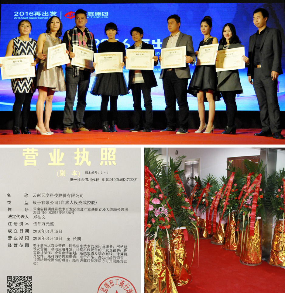 2016年1月28日,云南天度集團董事長鄭桂文向所有獲得股份獎勵的員工頒發(fā)了《股權(quán)證書》,并將所有股東、董事、監(jiān)事提交到云南省工商行政管理局進行了正式登記。