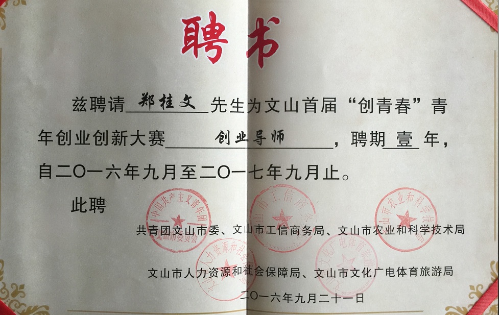 2016年9月21日10點(diǎn),由文山市委副書記劉建萍同志宣布:文山市首屆‘創(chuàng)青春’青年創(chuàng)業(yè)創(chuàng)新大賽正式啟動(dòng),并為天度集團(tuán)董事長(zhǎng)鄭桂文等五位創(chuàng)業(yè)導(dǎo)師頒發(fā)了導(dǎo)師聘書。