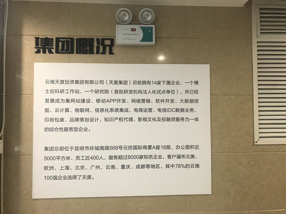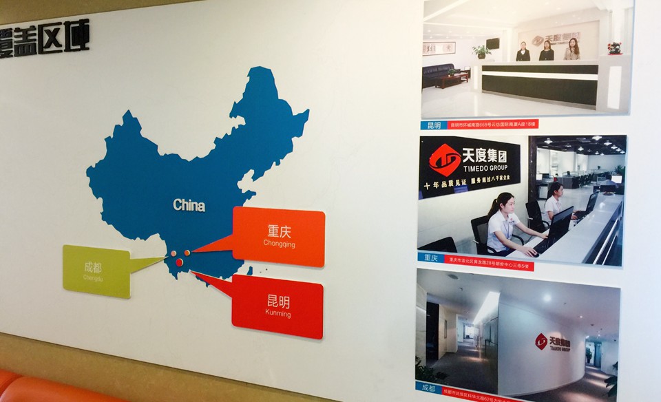 集團(tuán)概況的文化墻對(duì)面就是咱們天度更詳細(xì)的“集團(tuán)架構(gòu)”,分別羅列出了重慶、昆明、成都三個(gè)總部的子公司,讓客戶對(duì)天度集團(tuán)名下的子公司有更深入的認(rèn)識(shí),也從正面證明了天度12年積累下來的傲人的成果。