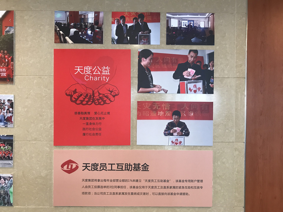 每一分榮譽(yù)證書的背后,都離不開為集團(tuán)默默付出的員工。天度集團(tuán)也珍視每一位員工,特別在集團(tuán)內(nèi)部設(shè)立“天度公益”,一個(gè)只屬于天度員工的互助基金,賬戶管理由全體員工投票選出三位同事?lián)?,?dāng)公司員工及家屬發(fā)生重病或?yàn)?zāi)害時(shí),可以直接向該基金申請(qǐng)救助!
