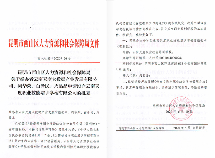 云南天度職業(yè)技能培訓學校獲批成立,并取得《民辦學校辦學許可證》,免費電商培訓、網(wǎng)絡(luò)直播培訓、企業(yè)職業(yè)技能提升培訓等業(yè)務(wù)板塊正式啟動