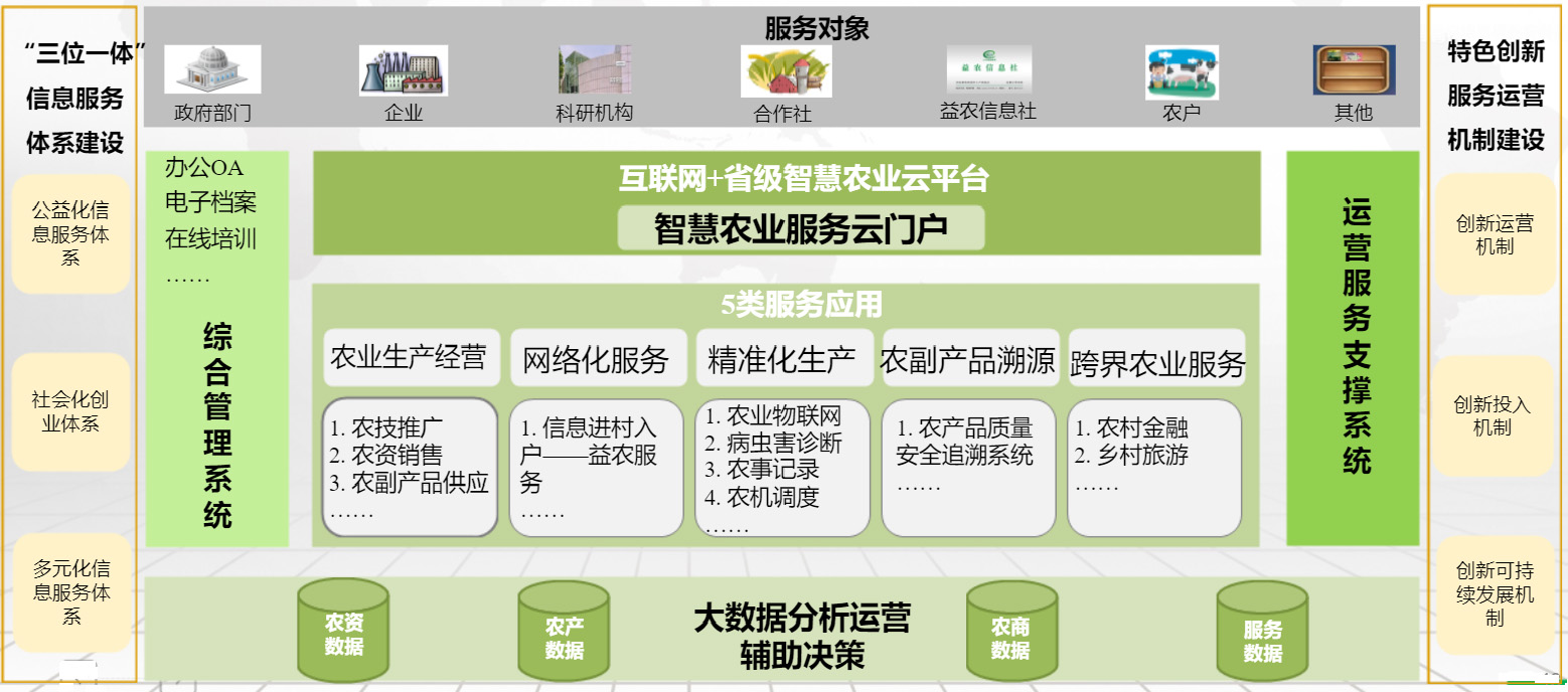 以農(nóng)業(yè)資源為基礎(chǔ)、市場為導(dǎo)向、效益為中心、產(chǎn)業(yè)化為抓手,面向農(nóng)業(yè)管理部門、農(nóng)技推廣部門、農(nóng)業(yè)企業(yè)、農(nóng)業(yè)園區(qū)/基地、農(nóng)業(yè)專家、農(nóng)民等多層次用戶體系,充分利用計算機與網(wǎng)絡(luò)技術(shù)、物聯(lián)網(wǎng)技術(shù)、音視頻技術(shù)、無線通信技術(shù)、大數(shù)據(jù)技術(shù)、云計算及專家智慧與知識,集成傳感器、土壤墑情采集站、監(jiān)控視頻頭、水肥藥一體機、太陽能氣象站、太陽能捕蟲儀、太陽能電磁閥、智能手機等智能化自動化設(shè)備,建設(shè)以農(nóng)產(chǎn)品質(zhì)量安全、農(nóng)資安全監(jiān)管、農(nóng)業(yè)區(qū)域資源為主的監(jiān)管平臺,以種植指導(dǎo)、病蟲害防治、標準化生產(chǎn)、農(nóng)業(yè)物聯(lián)網(wǎng)、農(nóng)業(yè)生產(chǎn)診斷決策為主的生產(chǎn)管理平臺,以及以農(nóng)業(yè)資訊、農(nóng)產(chǎn)品價格走勢、農(nóng)產(chǎn)品交易、營銷推廣、質(zhì)量溯源、植物醫(yī)院、農(nóng)技推廣服務(wù)、人力資源服務(wù)為主的信息服務(wù)平臺,實現(xiàn)更完備的信息化基礎(chǔ)支撐、更集中的數(shù)據(jù)資源、更深入的政府監(jiān)管、更先進的生產(chǎn)管理、更貼心的公眾服務(wù),實現(xiàn)農(nóng)業(yè)生產(chǎn)、監(jiān)管、服務(wù)一體化支撐,以及農(nóng)業(yè)農(nóng)村全方位、全過程的信息化、智慧化管理,達到信息技術(shù)與產(chǎn)業(yè)發(fā)展的和諧提升,推動現(xiàn)代農(nóng)業(yè)快速發(fā)展。