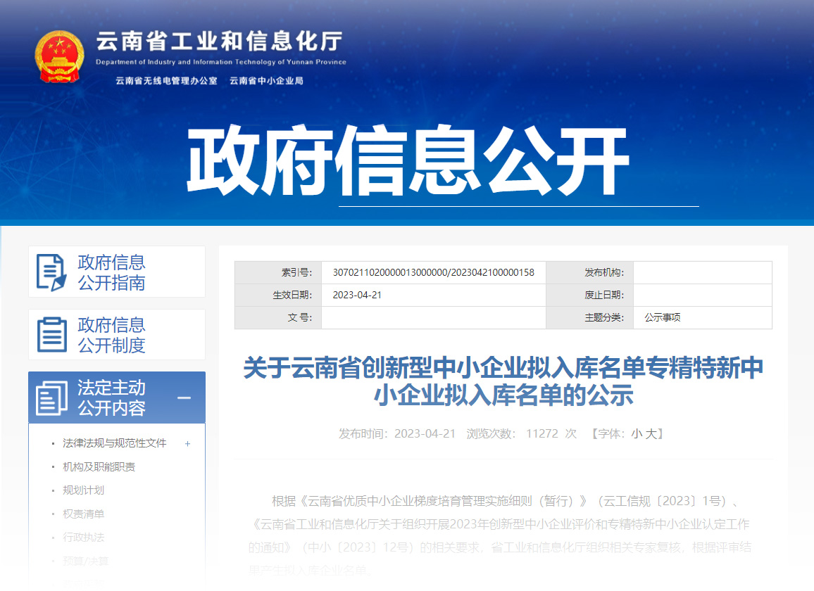 根據(jù)《云南省優(yōu)質(zhì)中小企業(yè)梯度培育管理實(shí)施細(xì)則(暫行)》(云工信規(guī)〔2023〕1號)、《云南省工業(yè)和信息化廳關(guān)于組織開展2023年創(chuàng)新型中小企業(yè)評價和專精特新中小企業(yè)認(rèn)定工作的通知》(中小〔2023〕12號)的相關(guān)要求,經(jīng)省工業(yè)和信息化廳組織相關(guān)專家復(fù)核,天度集團(tuán)旗下云南天度軟件系統(tǒng)有限公司入選2023年云南省專精特新中小企業(yè)、云南省創(chuàng)新型中小企業(yè)名單;云南蔚嵐信息技術(shù)有限公司入選2023年云南省創(chuàng)新型中小企業(yè)名單。