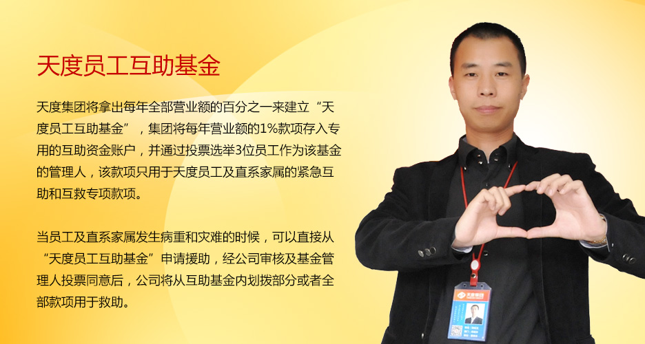 天度集團(tuán)將拿出每年?duì)I業(yè)額的百分來建立“天度員工互助基金”,集團(tuán)將每年?duì)I業(yè)額的近一成款項(xiàng)存入專用的互助資金賬戶,并通過投票選舉3位員工作為該基金的管理人,該款項(xiàng)只用于天度員工及直系家屬的緊急互助和互救專項(xiàng)款項(xiàng)。