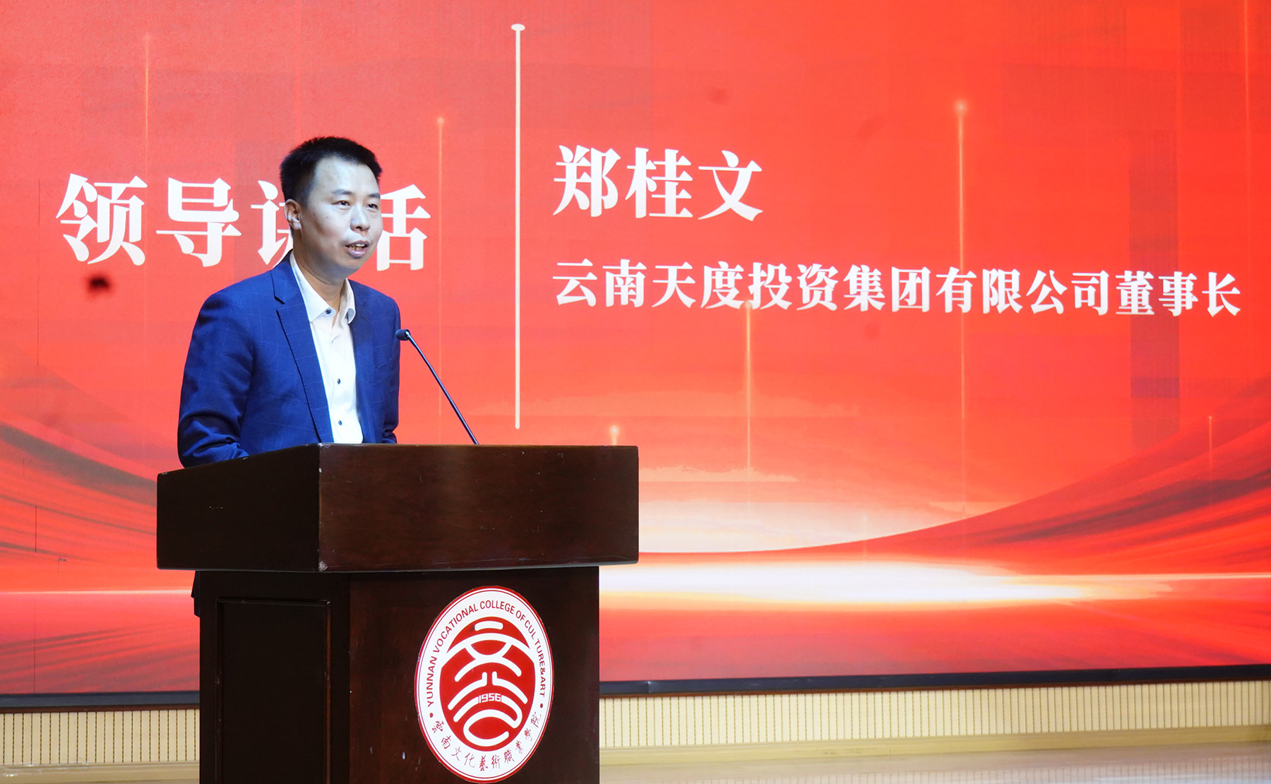 鄭桂文董事長(zhǎng)在致辭中表示,此次合作是校企雙方貫徹落實(shí)國(guó)家職業(yè)教育改革政策、深化產(chǎn)教融合的重要舉措,也是天度集團(tuán)踐行“以產(chǎn)業(yè)反哺教育、以教育賦能未來”使命的重要一步。天度集團(tuán)將發(fā)揮其作為區(qū)域數(shù)字經(jīng)濟(jì)龍頭企業(yè)所擁有大數(shù)據(jù)研究院、博士后科研工作站等技術(shù)資源優(yōu)勢(shì),以及深耕數(shù)字經(jīng)濟(jì)20年的產(chǎn)業(yè)優(yōu)勢(shì),與學(xué)校共同聚焦融媒體技術(shù)與運(yùn)營(yíng)、人工智能技術(shù)應(yīng)用、軟件技術(shù)、信息安全應(yīng)用技術(shù)等相關(guān)專業(yè),通過“共建共管”模式深化產(chǎn)教融合,圍繞數(shù)字經(jīng)濟(jì)、文旅融合等重點(diǎn)產(chǎn)業(yè)發(fā)展需求,共同建設(shè)校內(nèi)外實(shí)訓(xùn)基地,克隆企業(yè)真實(shí)研發(fā)環(huán)境,構(gòu)建專業(yè)集群交叉矩陣,共同制定專業(yè)發(fā)展規(guī)劃,定期評(píng)估產(chǎn)業(yè)趨勢(shì),動(dòng)態(tài)優(yōu)化課程體系,保持教學(xué)內(nèi)容與產(chǎn)業(yè)發(fā)展同步,實(shí)現(xiàn)“產(chǎn)業(yè)需求進(jìn)大綱、技術(shù)標(biāo)準(zhǔn)進(jìn)課堂、真實(shí)項(xiàng)目進(jìn)實(shí)訓(xùn)”,合力打造精準(zhǔn)適配市場(chǎng)需求的特色專業(yè)集群,培養(yǎng)數(shù)字經(jīng)濟(jì)領(lǐng)域高素質(zhì)技術(shù)技能型人才,賦能區(qū)域數(shù)字經(jīng)濟(jì)、文旅融合等重點(diǎn)產(chǎn)業(yè)發(fā)展。鄭董事長(zhǎng)還強(qiáng)調(diào)指出,希望通過此次合作,雙方將進(jìn)一步推動(dòng)成立產(chǎn)業(yè)學(xué)院并使其成為云南文化藝術(shù)產(chǎn)業(yè)數(shù)字化的“創(chuàng)新引擎”,讓每一位學(xué)子在這里找到“用技術(shù)守護(hù)文化、用創(chuàng)意點(diǎn)亮人生”的舞臺(tái)!共同書寫產(chǎn)教融合的新篇章,為云南乃至全國(guó)的數(shù)字經(jīng)濟(jì)及文旅融合產(chǎn)業(yè)注入新的活力與動(dòng)能!